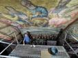 Знімок зроблений під час масштабної реставрації, що проводилася там в 1953-1956 роках. "«Я обратила внимание, что там, где изначально был изображен худощавый старец с длинными седыми волосами, появилось лицо молодого человека с пухлыми щеками и зачесан...